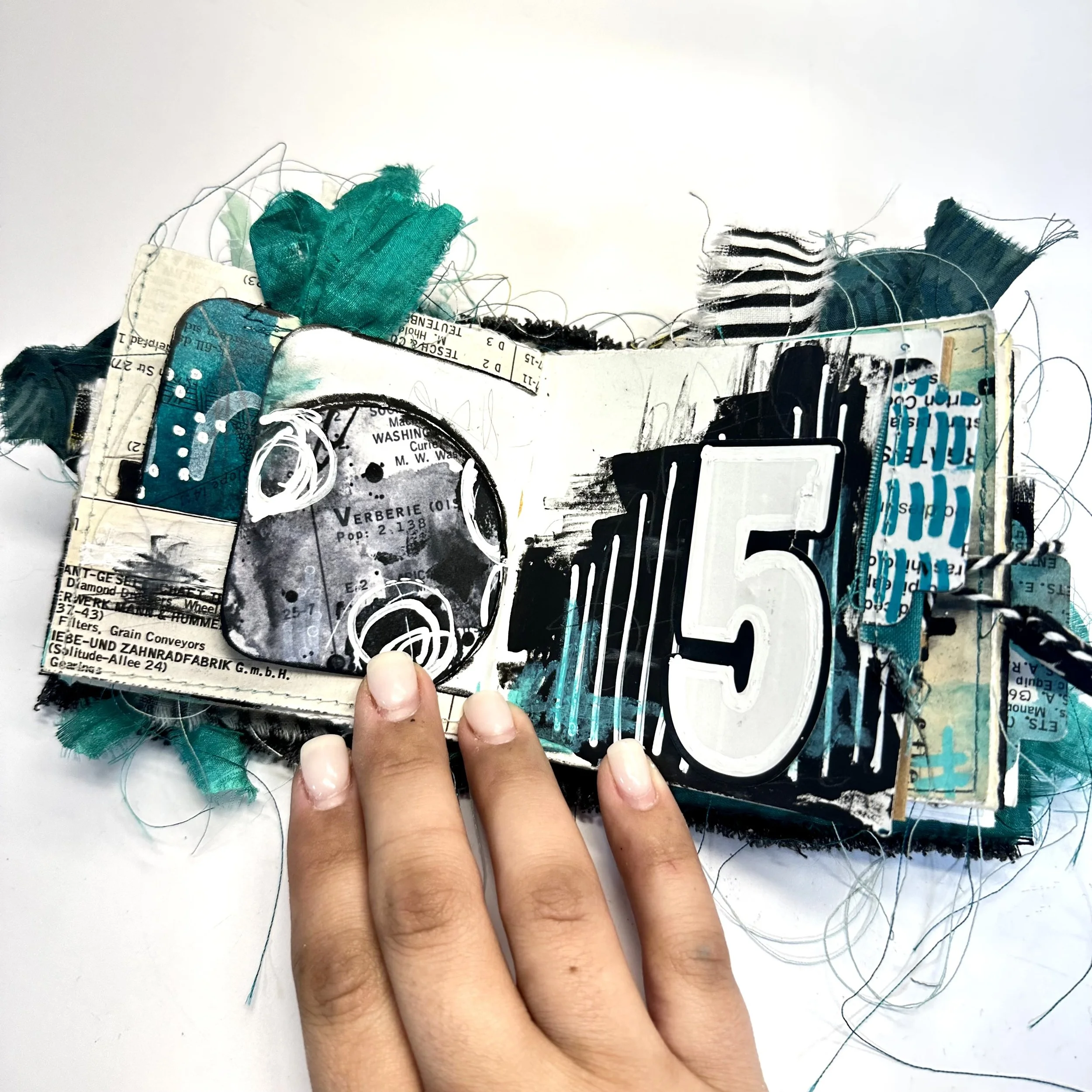 Instead of using black paint, try black gesso for its opacity and quick drying time. I think it is perfect for creating a bold black background that's ready for contrasting white elements. I added a large number sticker and outlined it with a white correction pen to add some boldness, and I decided to tie everything by adding a touch of color by smudging an oil pastel in the background.